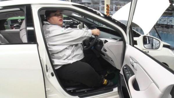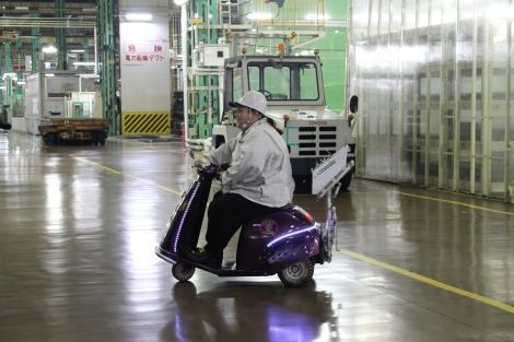 マツコさんは工場内の運搬・移動用のスクーターを試乗。