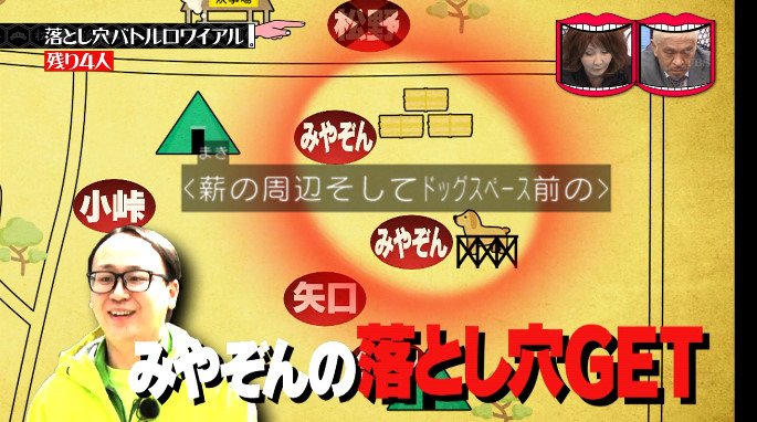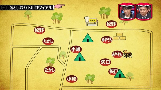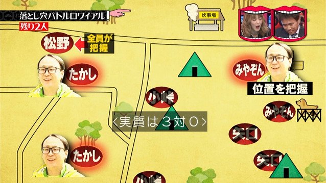 しかし、松野の穴は序盤で全員が位置を把握しており、みやぞんの穴はみやぞんの地図を盗んだたかしは知っている。
