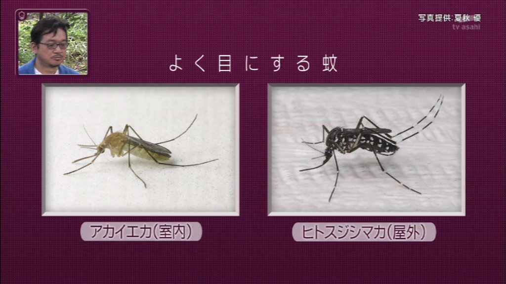 よくに目にする蚊は、室内に多いアカイエカと屋外に多いヒトスジシマカの2種類。