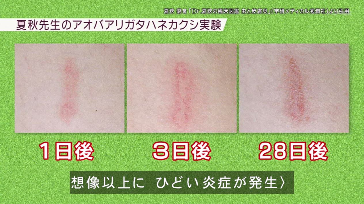 夏秋先生は毒虫による炎症の全経過を知るために、自らを実験台にして毒虫に刺されてきたそうです。