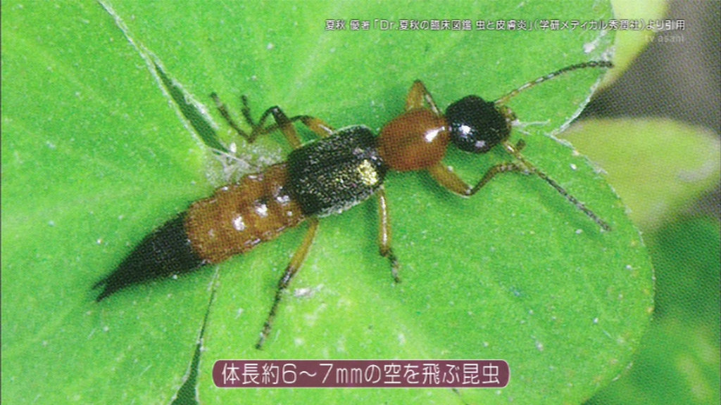 アオバアリガタハネカクシを体に押し付けてみる。
