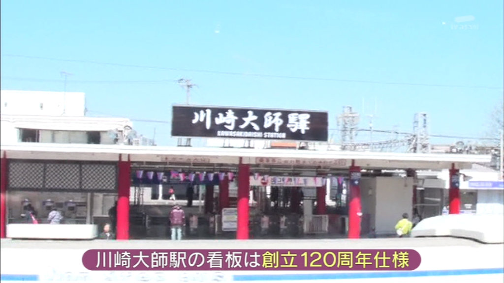 川崎大師駅の看板は創立120周年仕様。