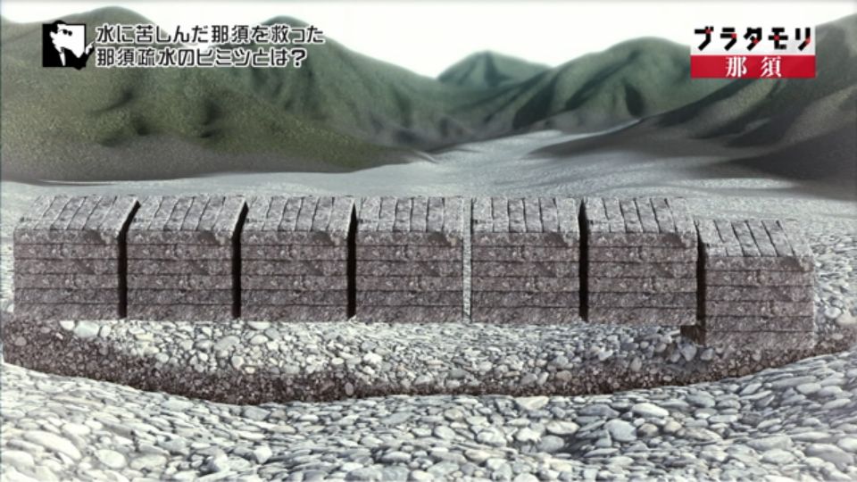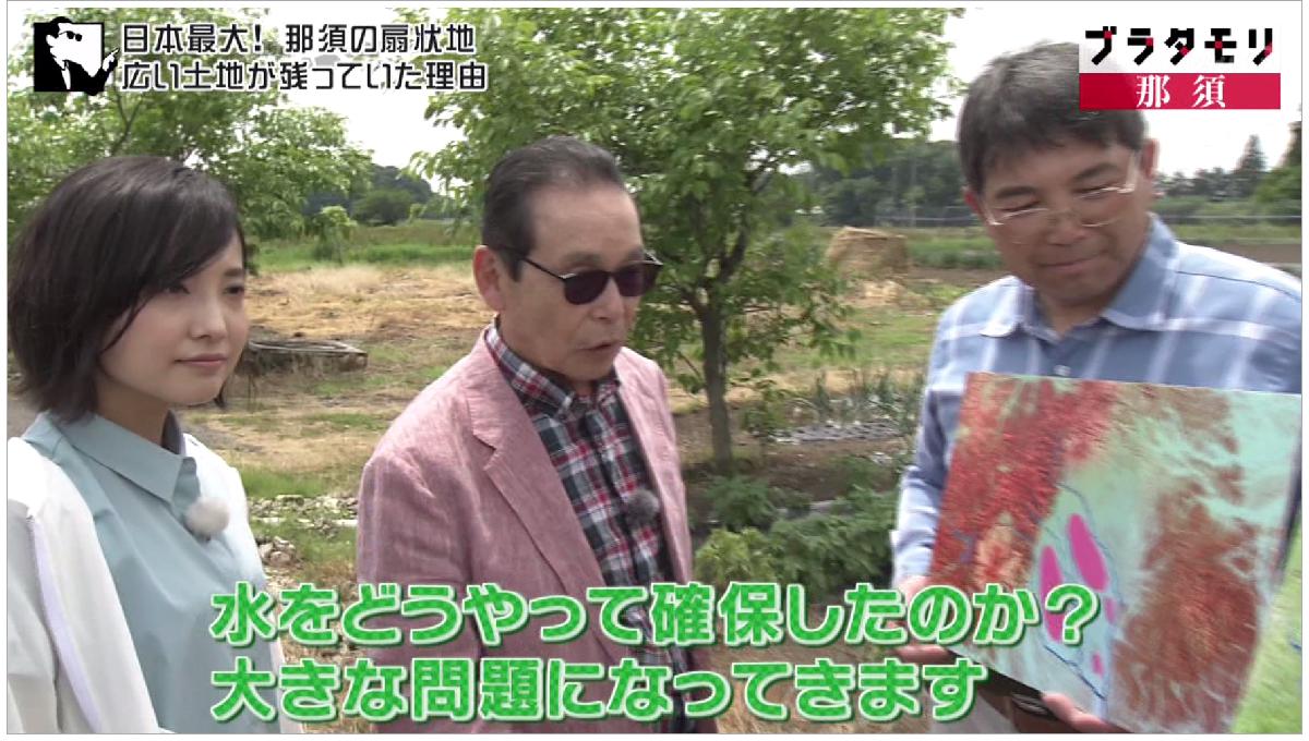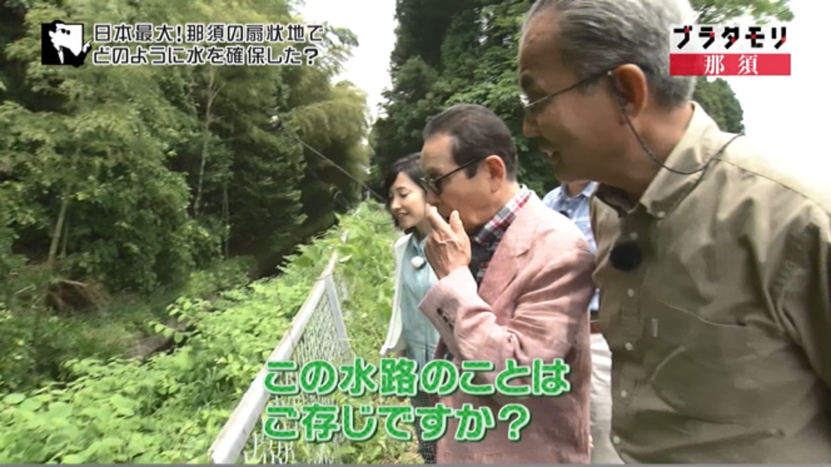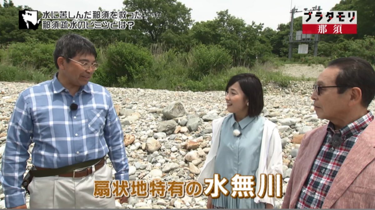 タモリさんたちは扇状地の中央を流れる川の近くにやってきました。