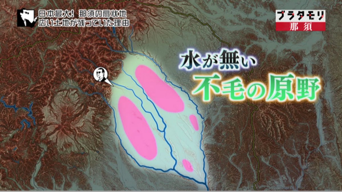 しかも、那須扇状地は水が地下深く浸みこんでしまい、中心部(ピンク色)は水が確保できない不毛の原野だった。