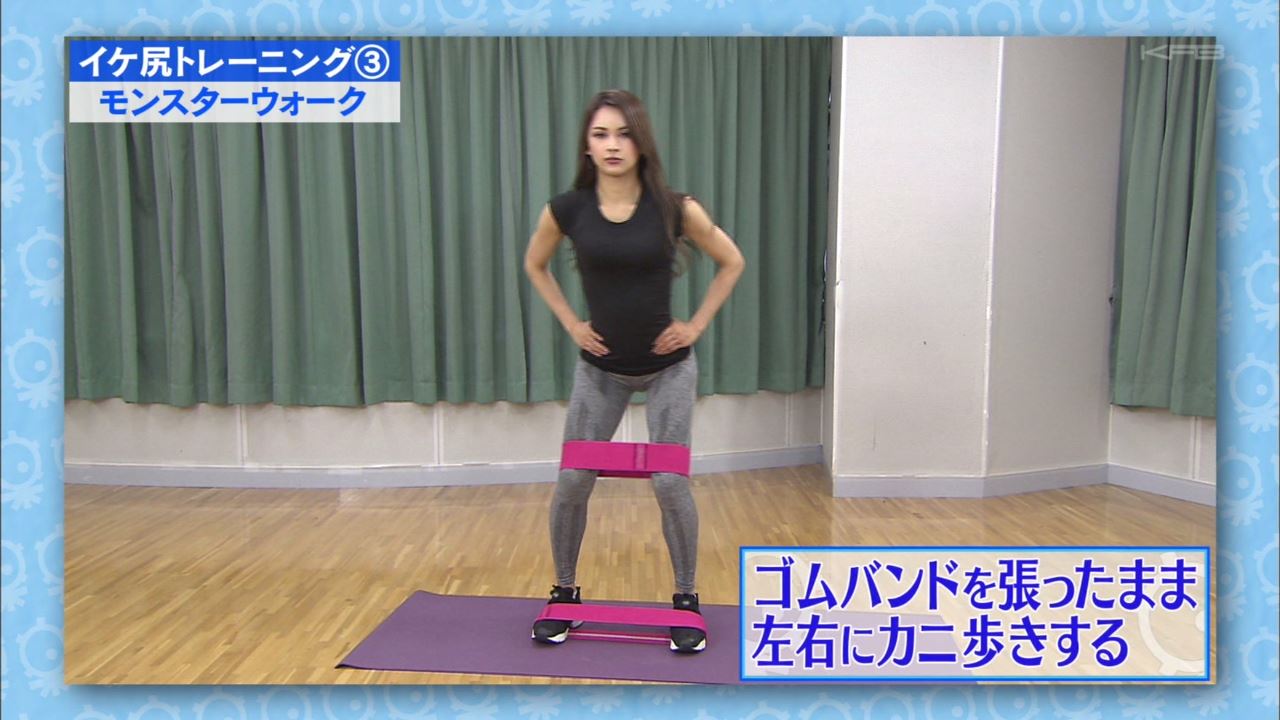 ゴムバンドを張ったまま、左右にカニ歩きをする(モンスターウォーク)。