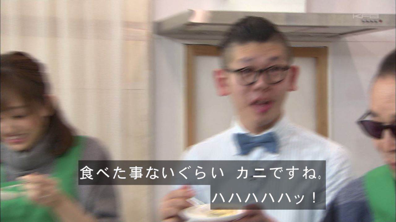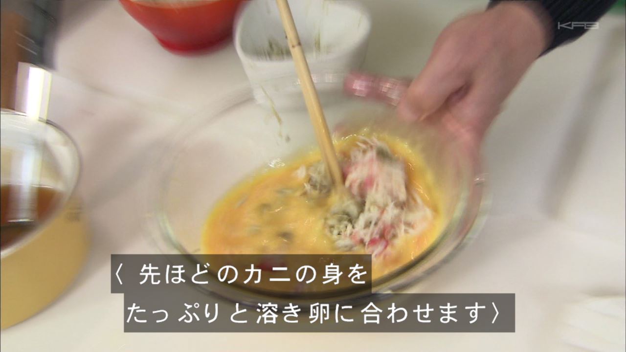タモリはカニの身と溶き卵を混ぜる。