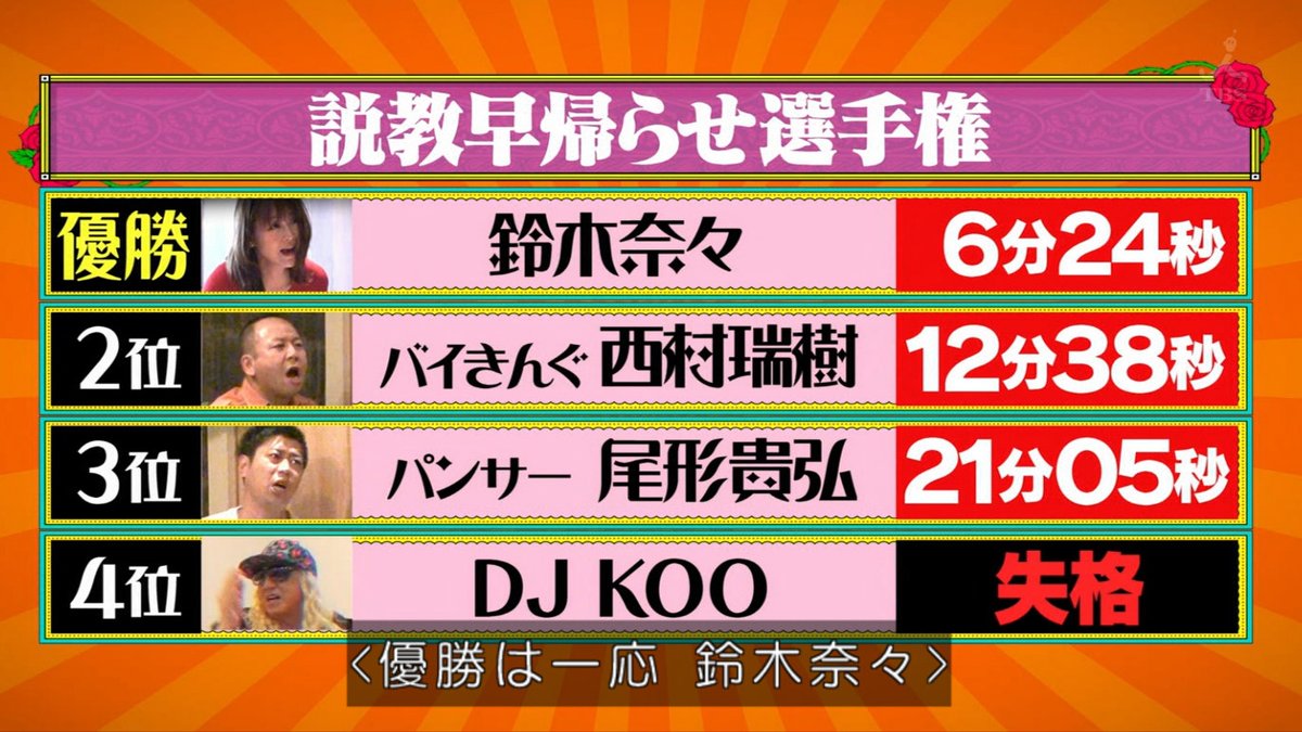 説教早帰らせ選手権は他がポンコツということもあり、鈴木奈々の圧勝。