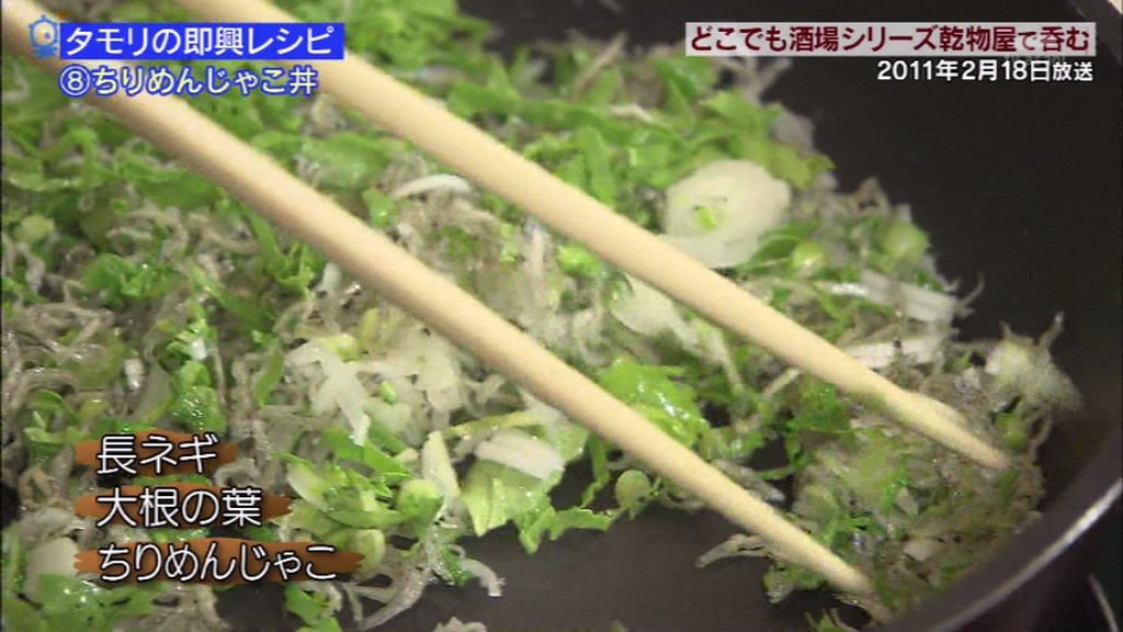 長ネギ、大根の葉、ちりめんじゃこをフライパンで炒る。
