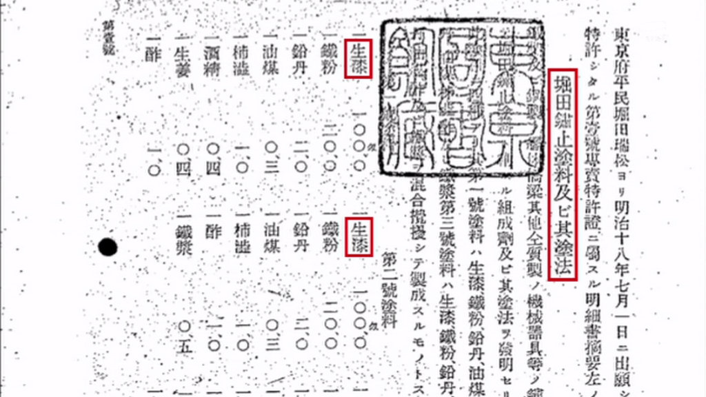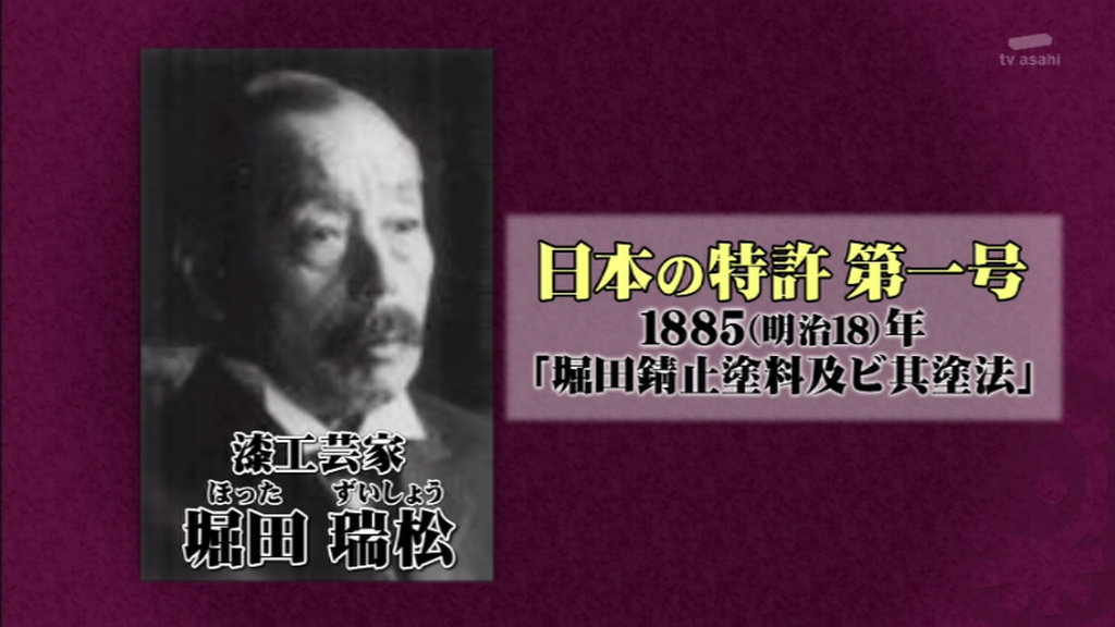 明治18年、漆工芸家の堀田瑞松が船底塗料で特許第1号を取得。