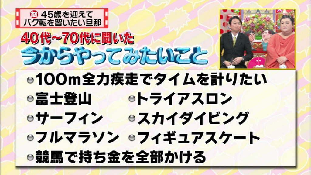 主婦(42)女性からの投稿、「今年45になる旦那が突然”バク転をできるようになりたい”と言い出した。体操教室でバク転だけ教えるコースがある、という情報をテレビで見たらしく、”人生で一度やってみたかったんだ”と無邪気な顔で言うのだが、まったく理解できない。私はオヤジになってからリスクあることにチャレンジしないでほしいと思っている」という内容でした。