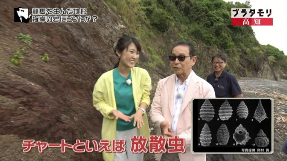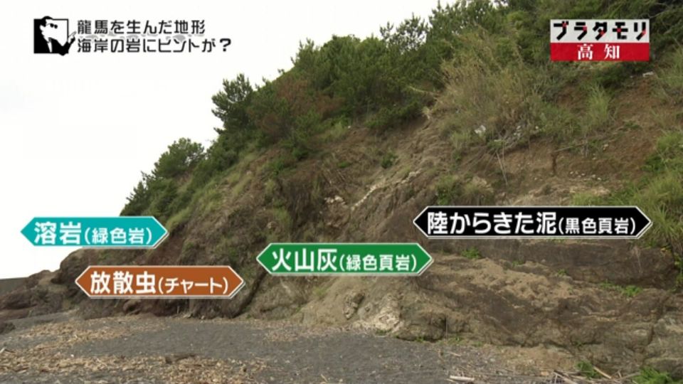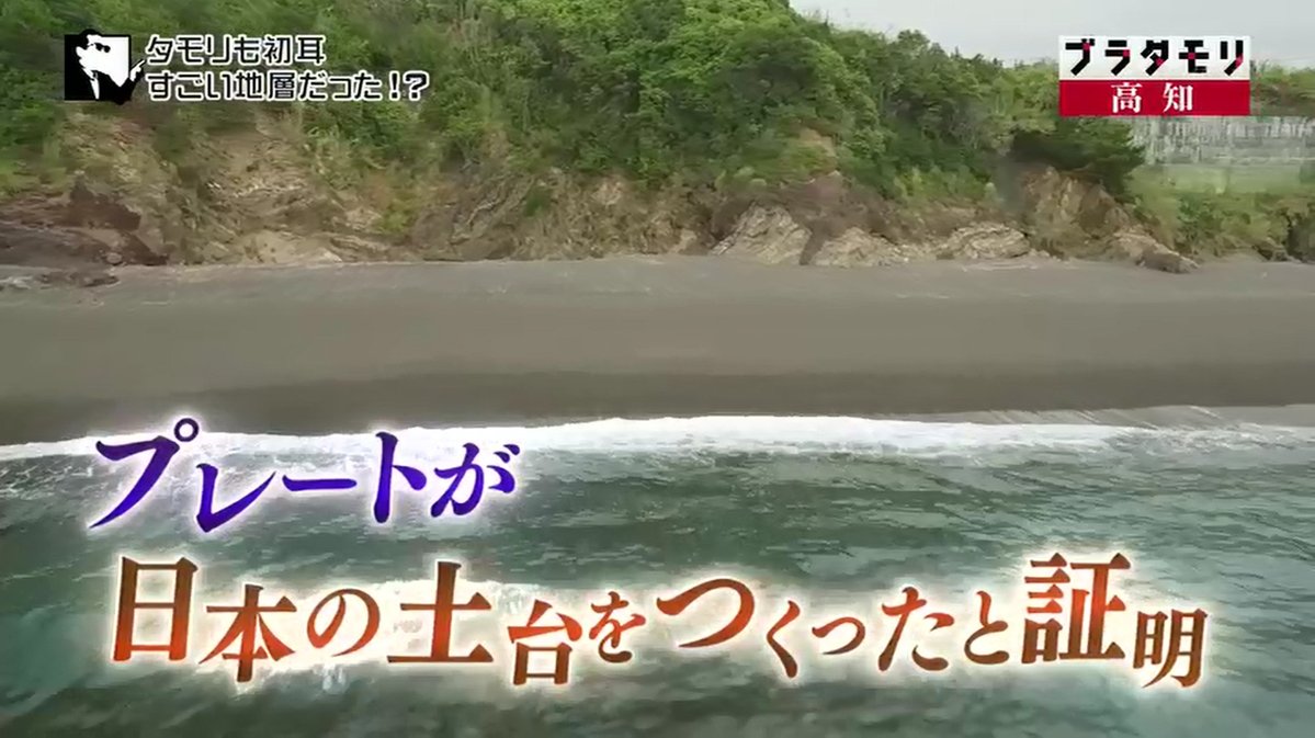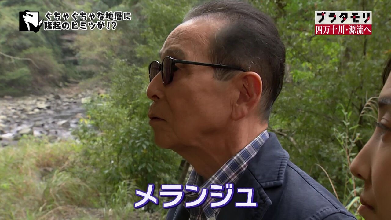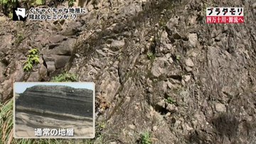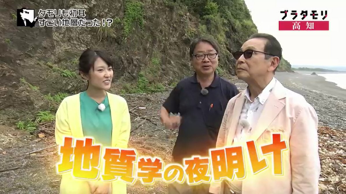 土地が隆起した理由を探るため、タモリさんたちは集落近くの小さな崖にやってきました。