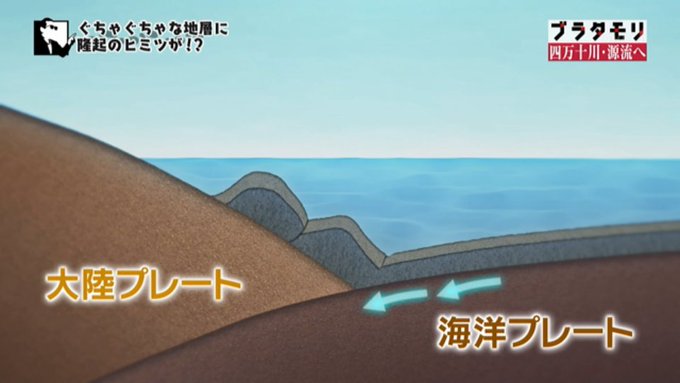 この時、海底に溜まった砂や泥が大陸プレートのヘリに押しつけられます(付加体)。