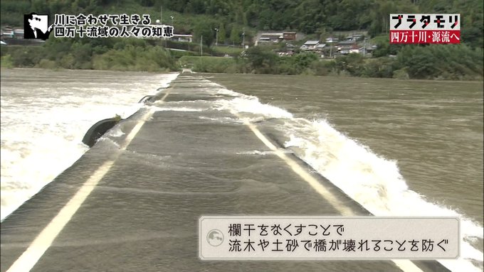 沈下橋は、欄干をなくすことによって流木や土砂で流されることを防いでいる。