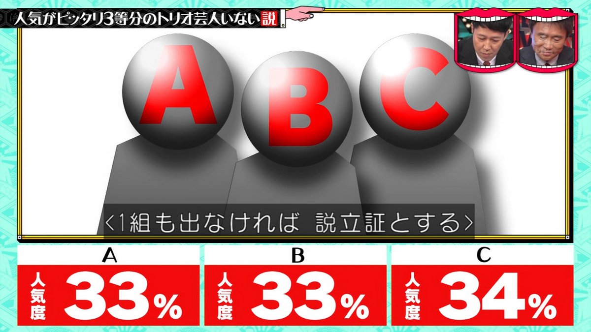 3人それぞれの人気度が30%台におさまれば説立証。