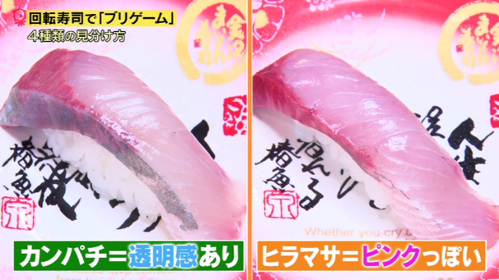 切り身にすると見分けがつかない4種類の魚(ハマチ、カンパチ、ヒラマサ、ブリ)。