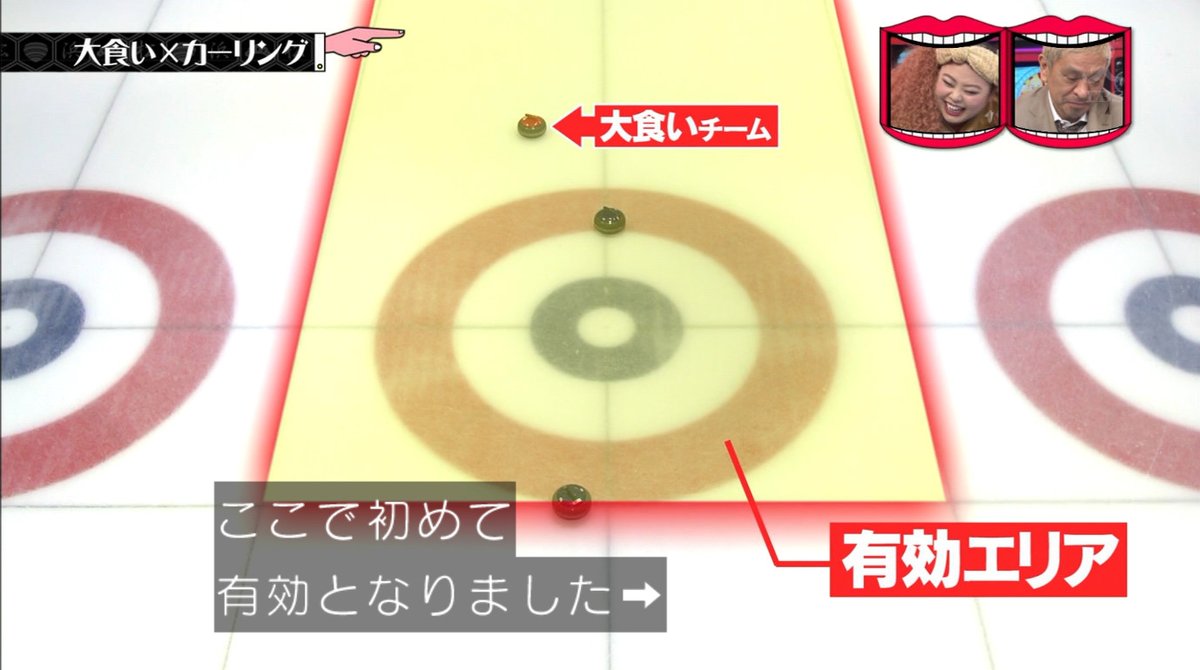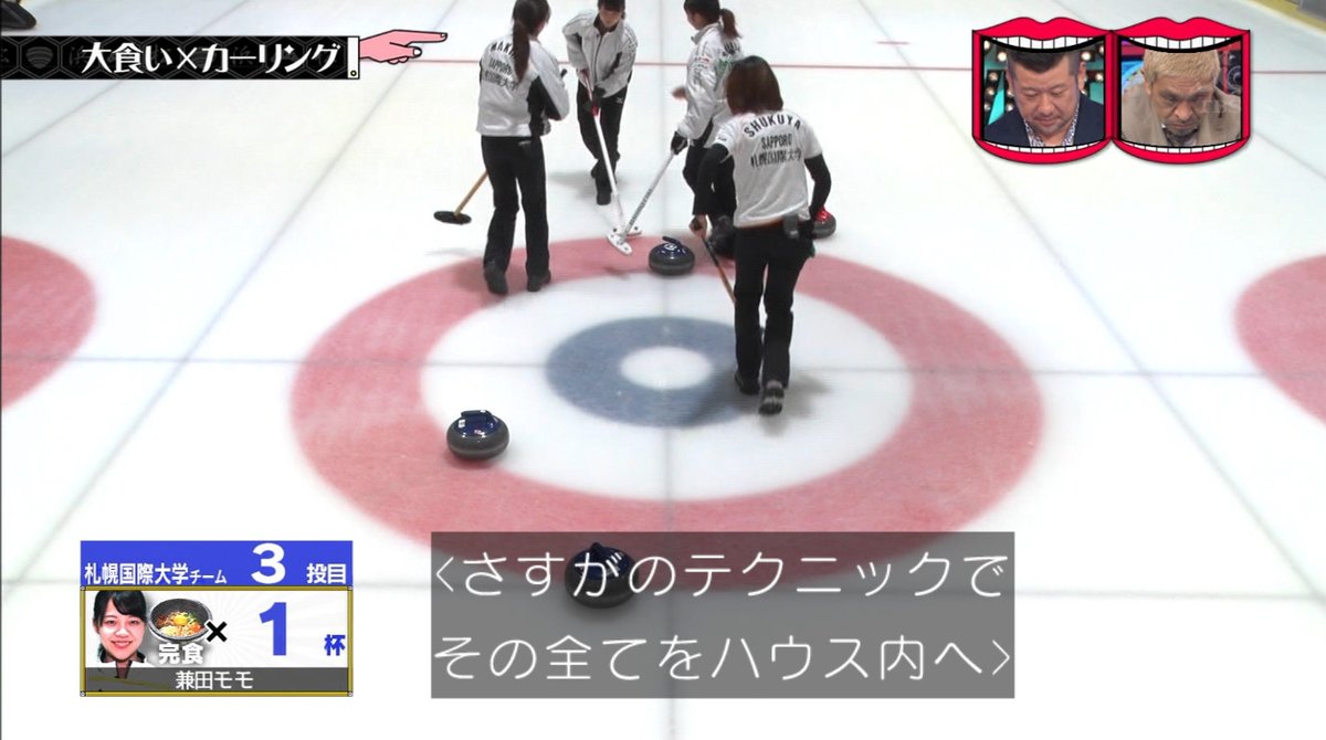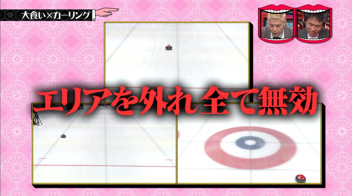 大食い×カーリング2回戦は、料理を完食し食べた器を投げる、というルール。