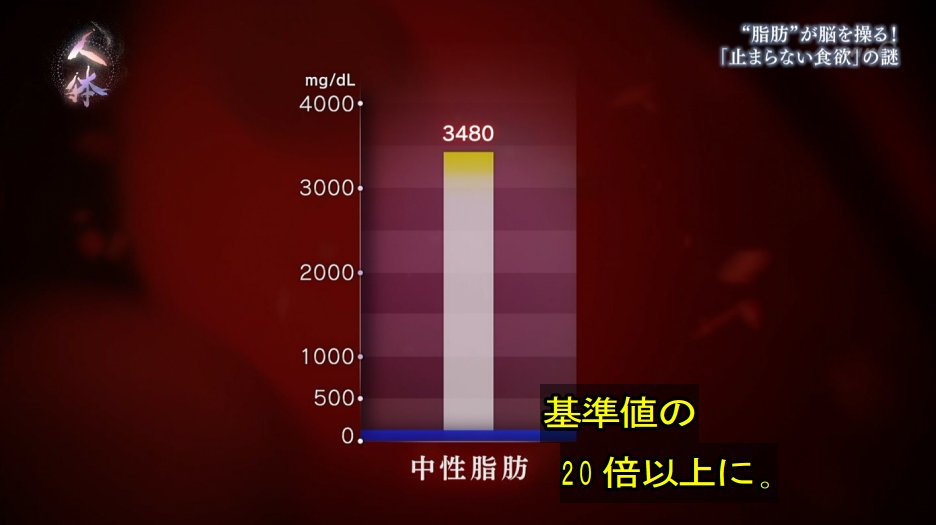 欲しがるままに食べると、血糖値は基準値の約1.5倍、中性脂肪は20倍以上にもなります。