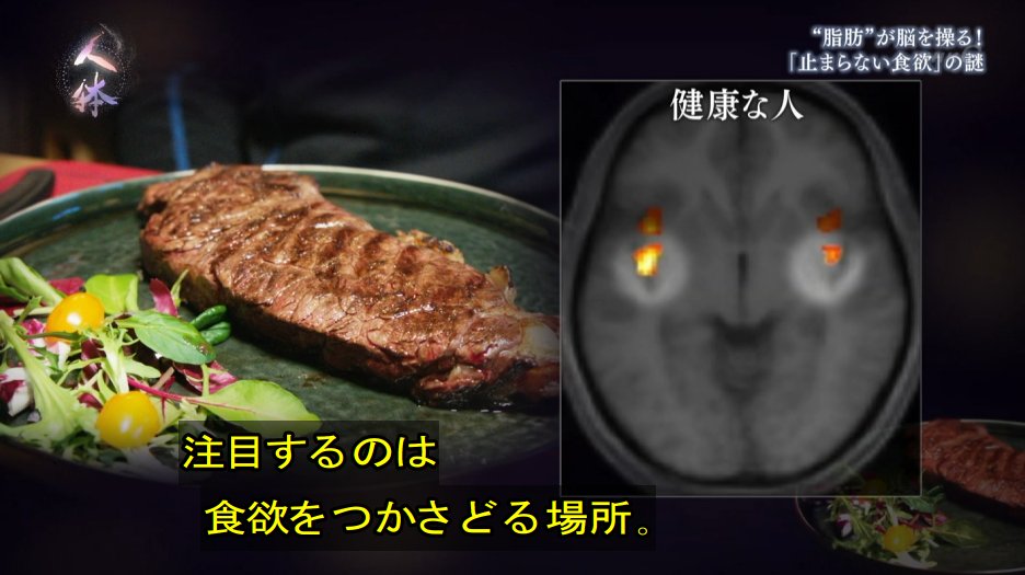正常な人では食事をするとその活動が収まりますが、脂肪萎縮症の人は食後も食欲の中枢の活動が収まりません。
