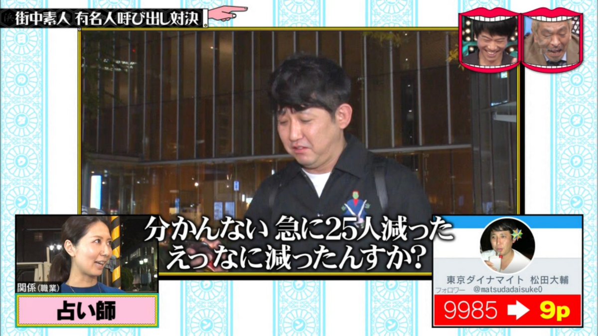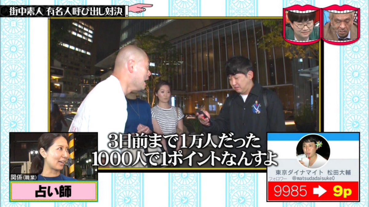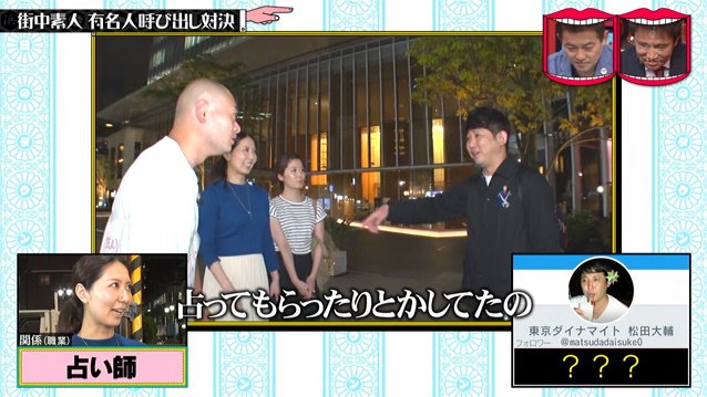 午後8時、占い師の女性に東京ダイナマイトの松田大輔を呼んでもらったあばれる君。