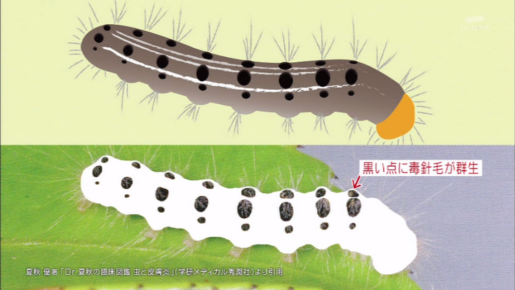 白くて長い毛には毒はなく、黒い点に密生する毒針毛が皮膚炎をおこす。